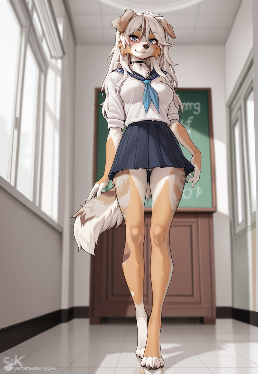 Senip, dog, medium breasts, multicolored fur, blue eyes, multicolored hair, furry female