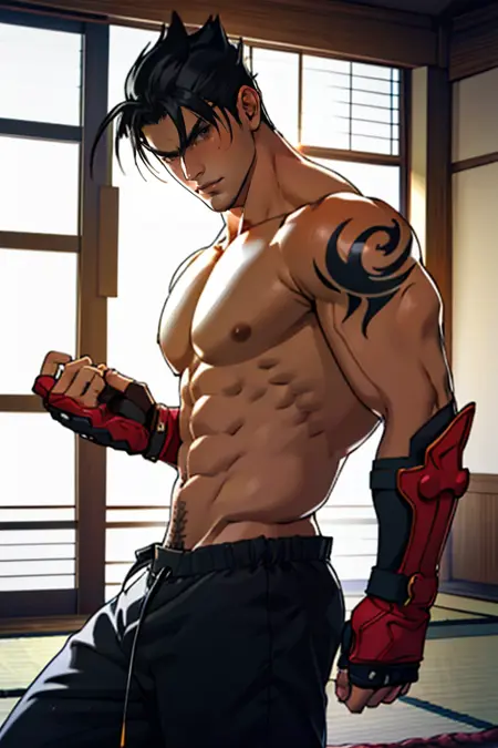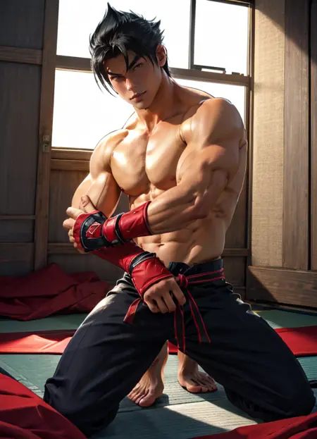 Tags: Jin_Kazama_Tekken, black hair, male focus, barefoot, pants, gauntlets, topless male