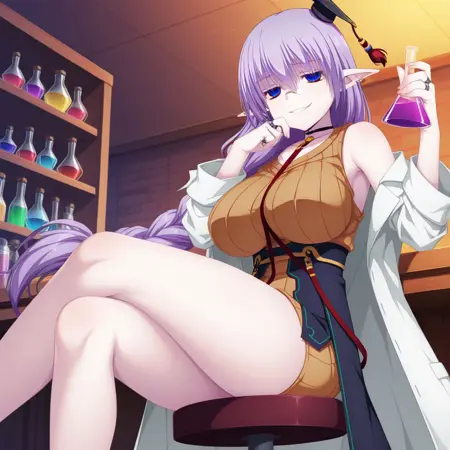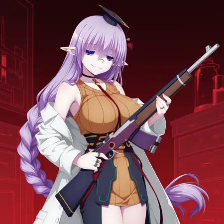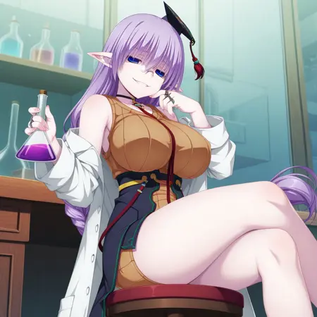 1girl,紫色头发,长发,编发,蓝眼睛,尖耳朵,大乳房,夹鼻眼镜,戒指,实验袍,无袖毛衣,短裙,橙色裙子,毛衣裙,橙色毛衣,项圈,红色领带,黑色腰披风,长腰披风,红色腰带,小方帽,腰束腹带,红色鞋子,