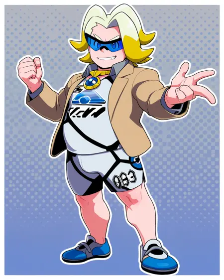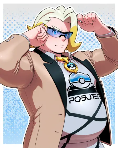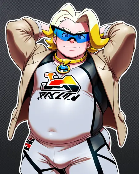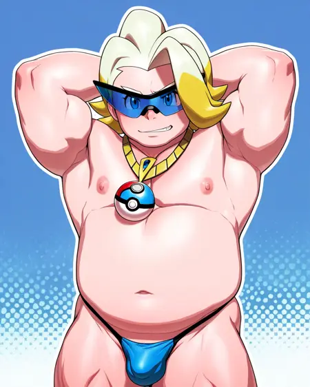 触发词:gordie_pokemon_ill, gordie, 蓝色镜片太阳镜,五彩头发,双色头发,白色和金色头发,圆润,胖,肌肉发达, bara,