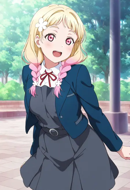 natsumi_onitsuka, 긴 머리, 금발, 머리 장식, 분홍색 머리, 땋은 머리, 꽃, 다색 머리, 머리 꽃, 분홍색 눈, 두 줄 땋은 머리, 그라데이션 머리, 셔츠, 드레스, 리본, 자켓, 흰색 셔츠, 벌어진 옷, 칼라 셔츠, 벌어진 자켓, 빨간 리본, 목 리본, 파란 자켓, 앞치마 드레스, 회색 드레스, 유이가오카 학교 유니폼,