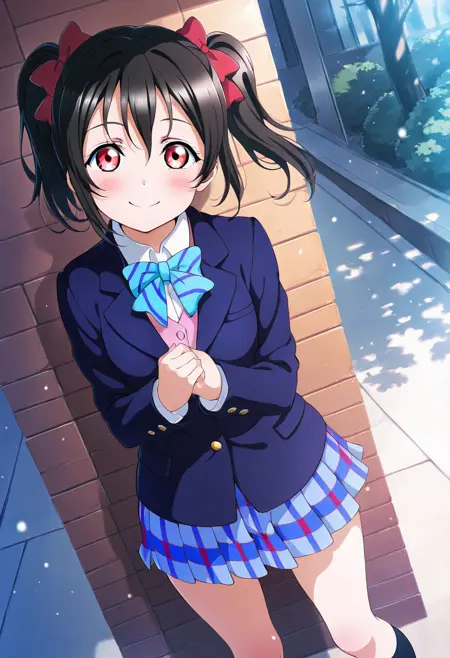 niko_yazawa、黒髪、赤い目、リボン、ツインテール、髪のリボン、スカート、ジャケット、ブレザー、冬の制服、音ノ木坂学園の制服
