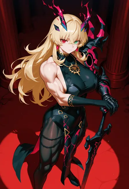 第三昇格: barghestst3, horns, heterochromia, black sclera, leotard, center opening, armor, shoulder armor, pauldrons, gauntlets, thighs, cleavage