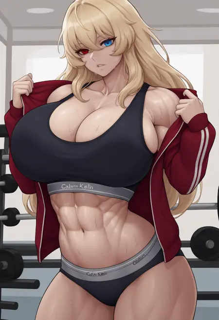 展示用衣装: bghstbodysuit, muscular female, abs, long hair, blonde hair, sunglasses, eyewear on head, horns, heterochromia, red eyes, green eyes, black bodysuit, fur-trimmed bodysuit, center opening, shoulder armor, black gloves, thick thighs, navel, cleavage, huge breasts