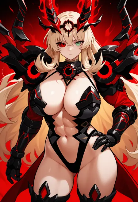 第三階級: bghstst3, 腹筋, 長い髪, 金髪, 頭飾り, 多色の角, 黒い角, 赤い角, 異色瞳, 赤い目, 緑の目, 異なる虹彩, 黒い虹彩, セクシーな衣装, 黒いレオタード, 中央開口部, 肩甲板, 肩当て, 手甲, 太ももまであるストッキング, 肚臍, 胸元の露出, 大きな胸