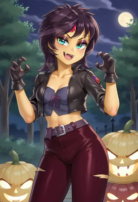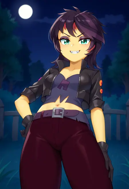 vampire fangs, spirky hair, dark hair, cropped jacket, ripped pants, dark gloves, short-sleeved jacket, dark red pants