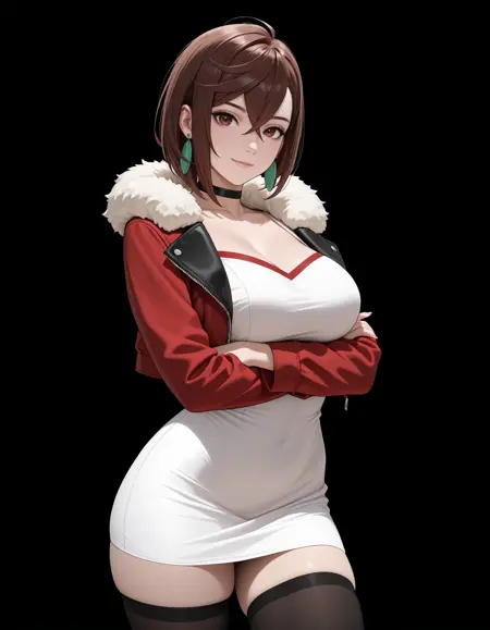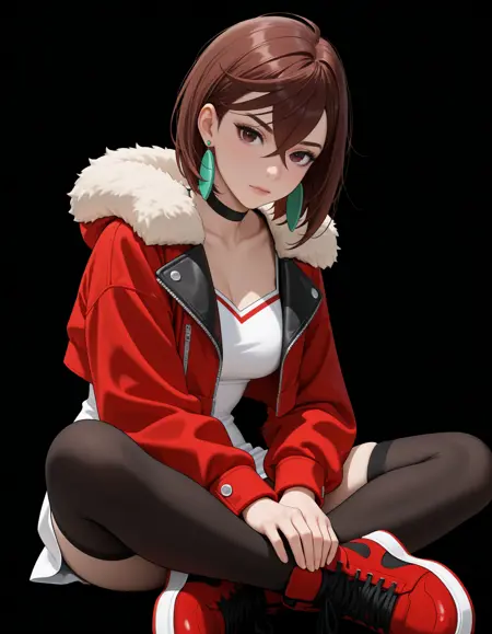j4cket,短款夹克,红色夹克,黑色项圈,白色连衣裙,短裙,红色装饰,毛皮镶边夹克,长袖,黑色过膝袜,敞开式夹克,红色鞋子,高帮鞋