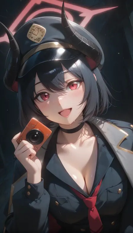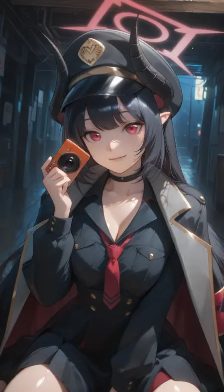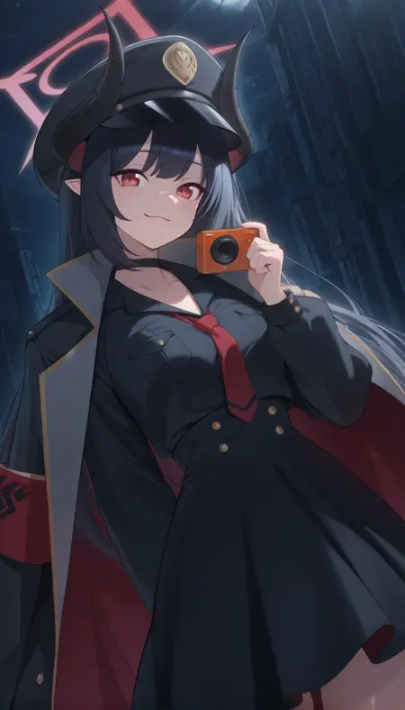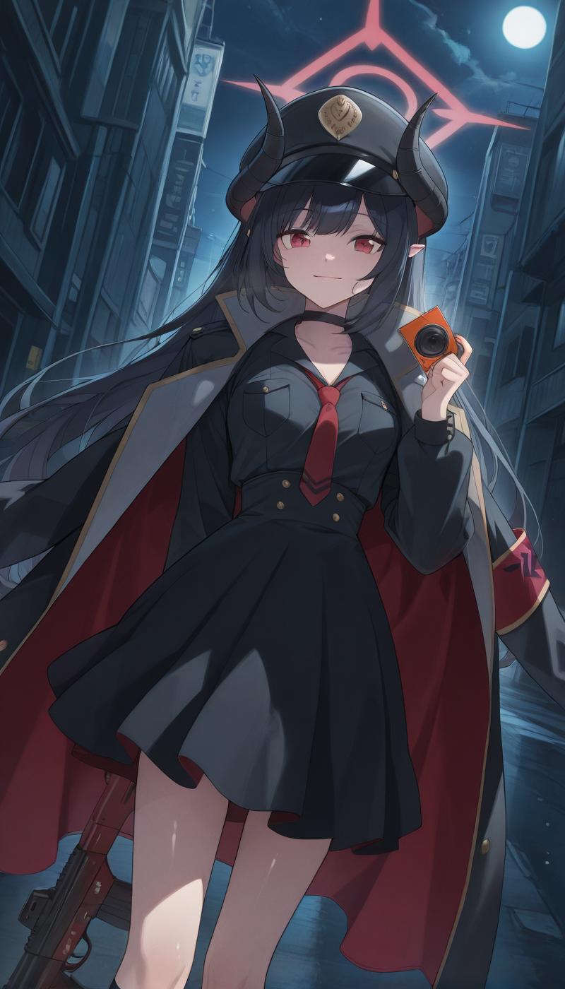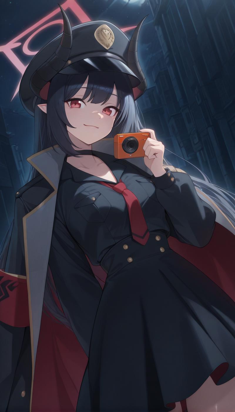 | 训练词汇 | BAMChiaki, long hair, black hair, red eyes, horns, pointy ears, halo, demon horns, black horns, red halo, 已复制! shirt, skirt, long sleeves, dress, hat, holding, jacket, necktie, collared shirt, choker, black skirt, coat, black shirt, black headwear, black choker, red necktie, armband, peaked cap, black coat, high-waist skirt, shirt tucked in, camera, coat on shoulders, holding camera,已复制! shirt, skirt, long sleeves, dress, hat, holding, jacket, school uniform, weapon, boots, necktie, choker, socks, black skirt, black footwear, holding weapon, coat, black shirt, gun, black headwear, kneehighs, black choker, holding camera, black socks, red necktie, holding gun, armband, peaked cap, rifle, black coat, high-waist skirt, shirt tucked in, assault rifle, coat on shoulders, bullpup, red armband, very long hair, black dress, open coat,已复制! |