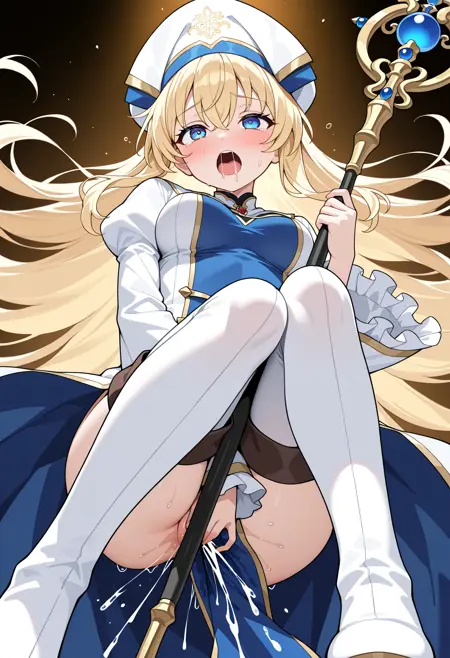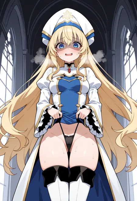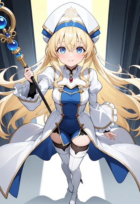 | 训练词汇 | shigoblitess, long hair, very long hair, blonde hair, hair between eyes, white headwear, cleric headdress, blue eyes, long sleeves, wide sleeves, puffy sleeves, frilled sleeves, juliet sleeves, white dress, frills, medium breasts, white thighhighs, thigh boots, white footwear,已复制! |