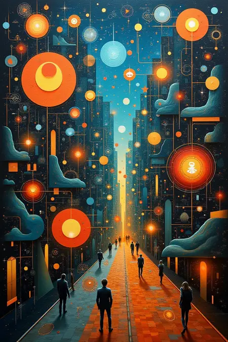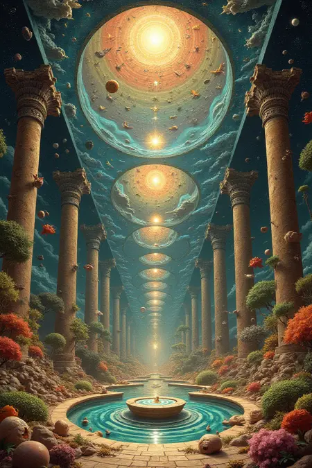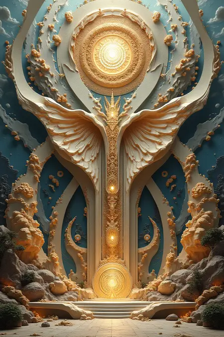“探索形而上学、秘教符号与替代维度的预言艺术。神圣几何、跨维度建筑、隐秘宇宙观、流动的有机形态、发光结构、非线性时间。”