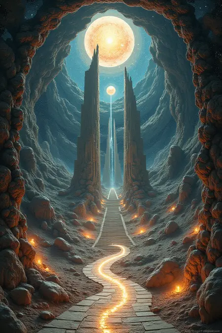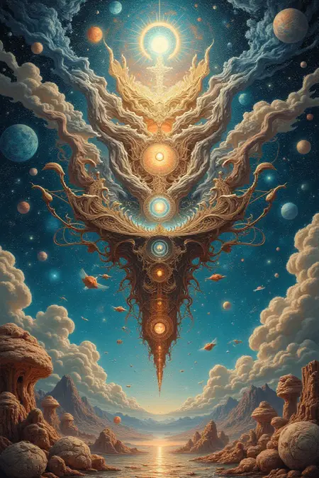 一座超现实的发光结构漂浮在宇宙虚空之中,交织着几何图案、天体符号与流动的有机形态。