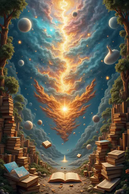 一座漂浮于星云中的空灵图书馆,书籍化作光芒与几何星座消散。