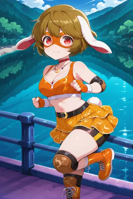 ringo, 1girl, solo, red eyes, brown hair, short hair, rabbit ears, floppy ears, rabbit tail,, ringo \(codename:mandarin\), medium breasts, alternate costume, domino mask, orange mask, bolt symbol, necklace, red choker, orange top, cleavage, wrestling outfit, fingerless gloves, orange gloves, midriff, black belt, crescent ornament, orange skirt, bike shorts, black shorts, black knee pads, kneehighs, cross-laced footwear, orange boots,