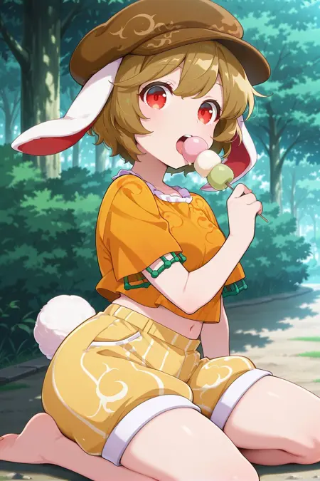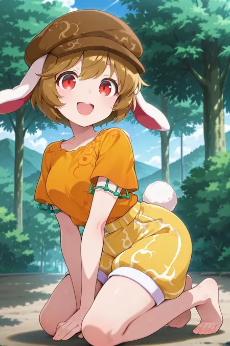 brown hat, newsboy cap, orange shirt, short sleeves, midriff, yellow shorts, barefoot,