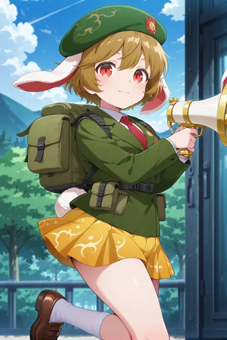 ringo, 1girl, solo, red eyes, brown hair, short hair, rabbit ears, floppy ears, rabbit tail,, ringo \(eagle ravi special forces\), alternate costume, green headwear, beret, green jacket, collared shirt, white shirt, red necktie, pleated skirt, yellow skirt, white socks, brown footwear, backpack, bag, lunatic gun,