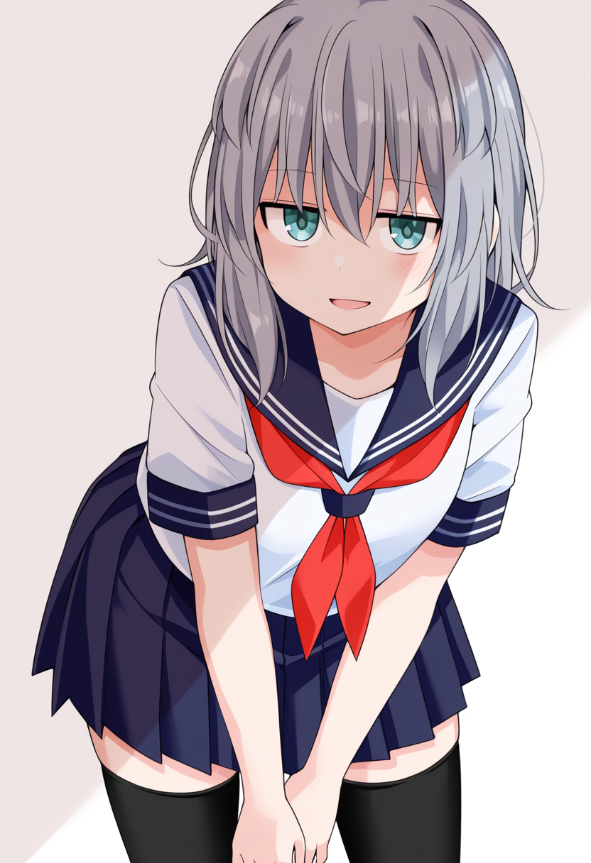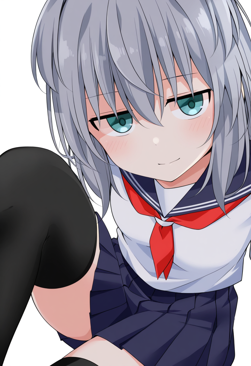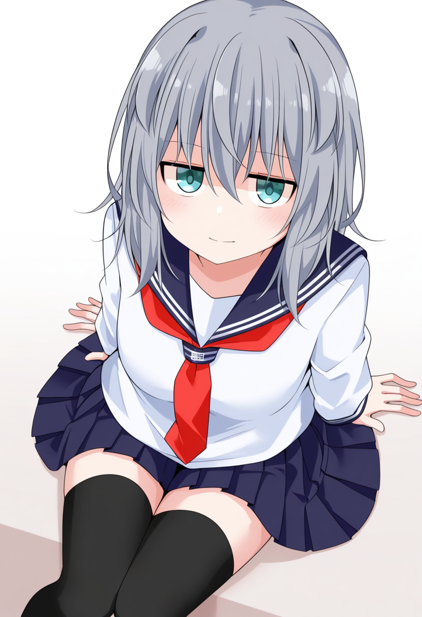 serafuku, school uniform, pleated skirt, ,zettai ryouiki, black thighhighs,