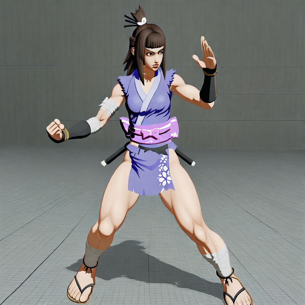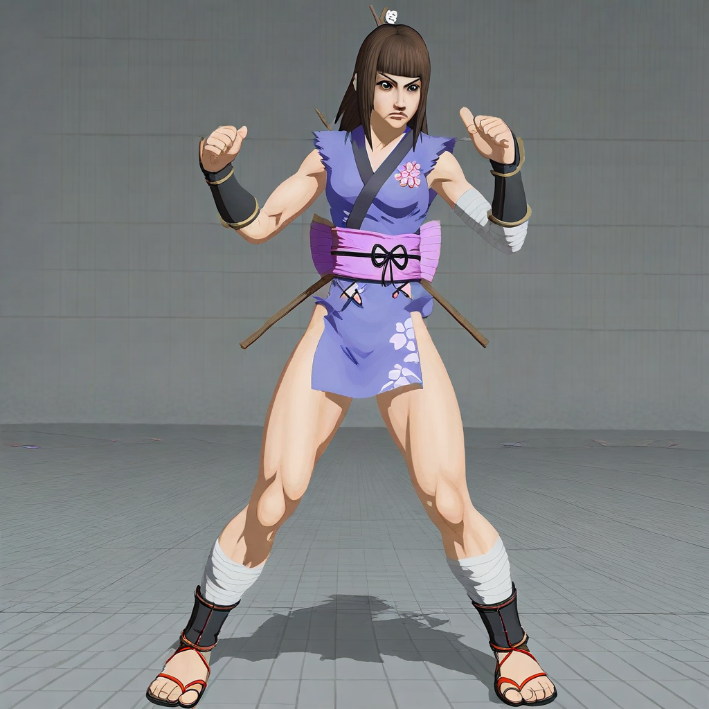 ibuki_kunoichi, 1girl, solo, japanese clothes, sandals, short kimono, hair, ornament hair, stick kimono, brown hair, bandages