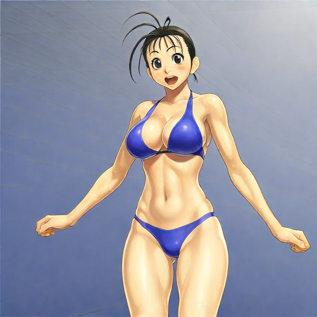ibuki_swimsuit, 1girl, swimsuit, bikini, blue bikini, breasts, antenna hair, black hair, ponytail, long hair, solo, large breasts