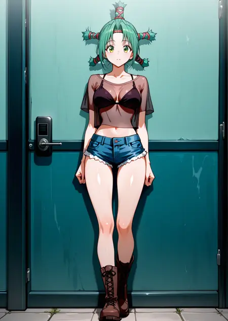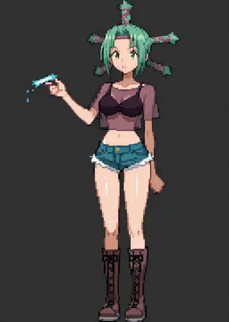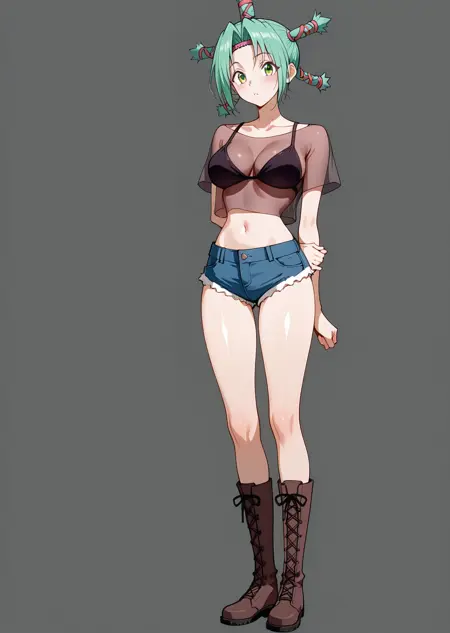 Prompts: green hair, braided hair, brazier, transparent shirt, denim shorts, booty shorts, skinny, narrow waist, brown boots