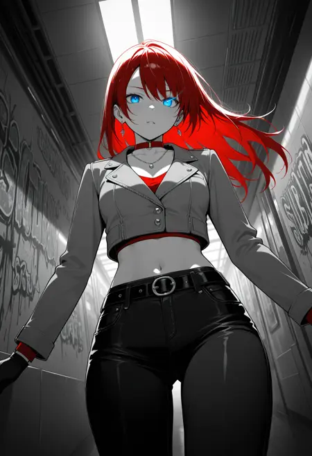 Optional clothing tags可选上衣:crop top,cropped jacket,earrings,grey jacket,jewelry,long sleeves,necklace,red choker,