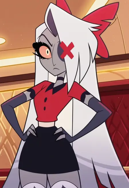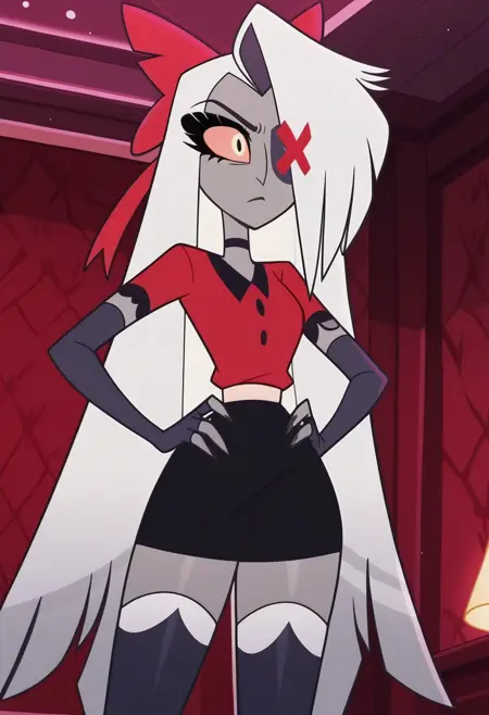 grey skin, hair over one eye, white hair, long hair, colored sclera, hair bow, X-shaped eye patch, choker, red shirt, elbow gloves, white waistband, fingerless gloves, miniskirt, thighhighs, 4 fingers