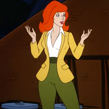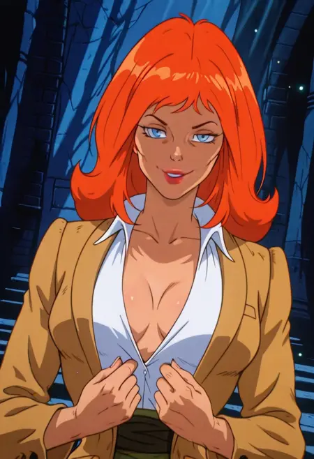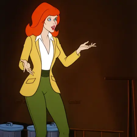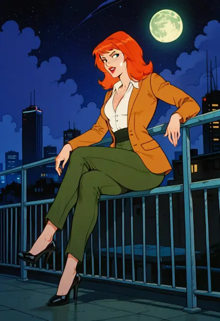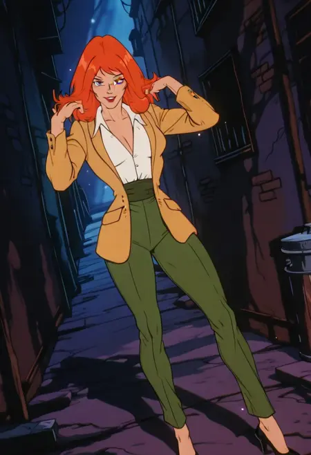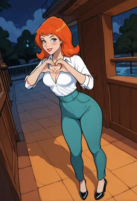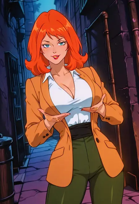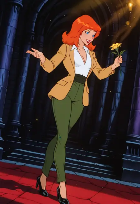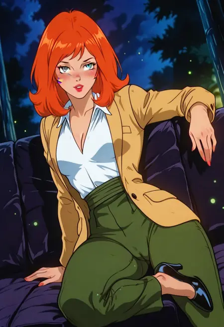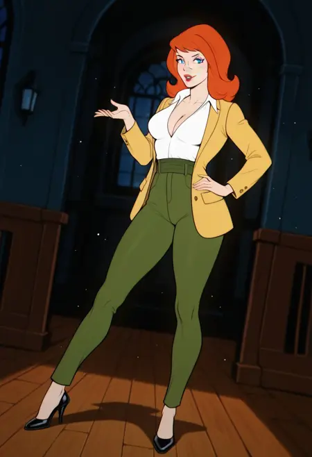 JessicaWrayFG、1人の女の子、シングル、細身の女の子、白い肌、オレンジ色の髪、レトロスタイルの髪型、青い目、満ちた唇、赤い口紅、オーカー色のジャケット、白いシャツ、白いカラー、大きな胸、深い胸元、ティール色のパンツ、太ももが太い、黒い靴、ハイヒール、