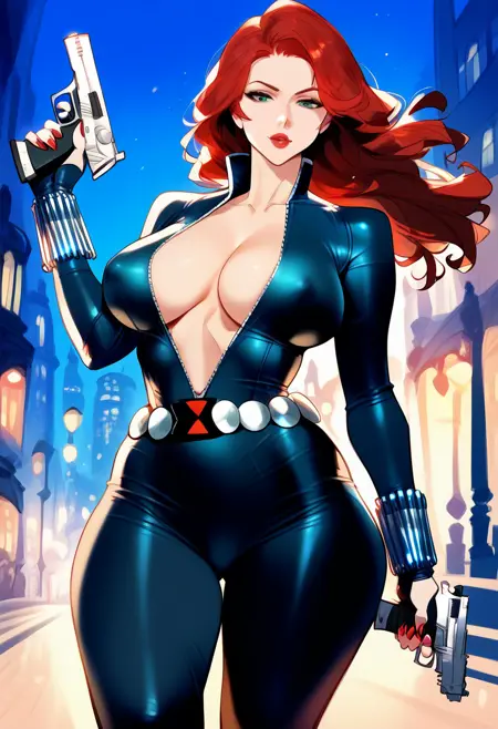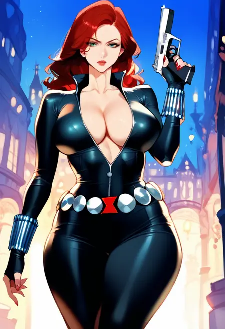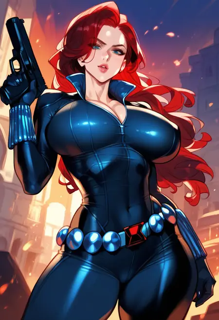 触发词:marblackwidow,大胸部,红发女性,长发,紧身衣,乳沟,紧身,手枪