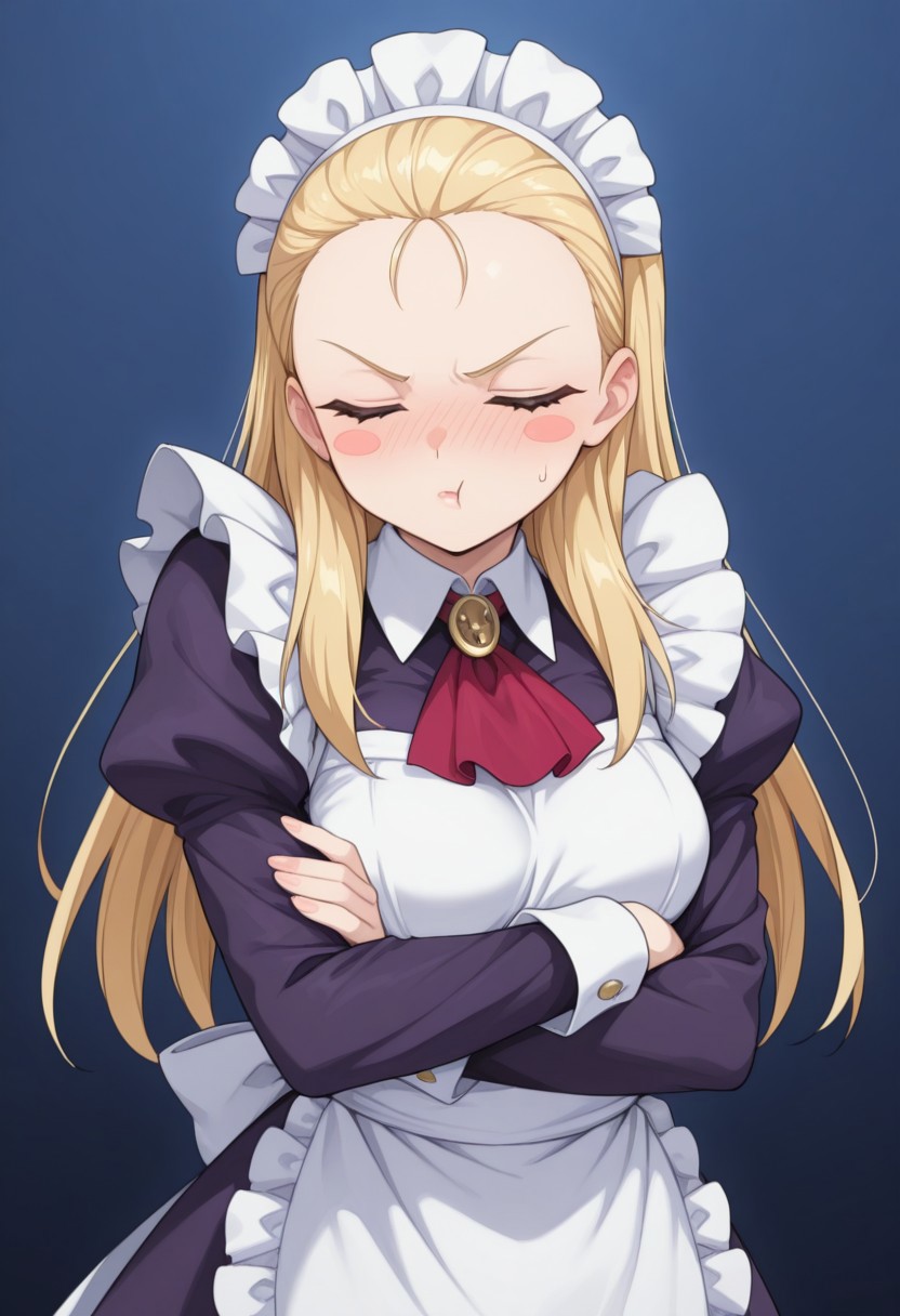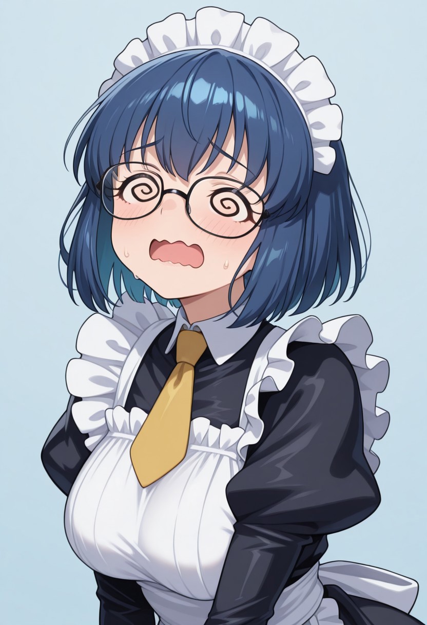 메이드, 메이드 앞치마, 메이드 헤드기어, 허벅지 부츠, 파랑 넥타이