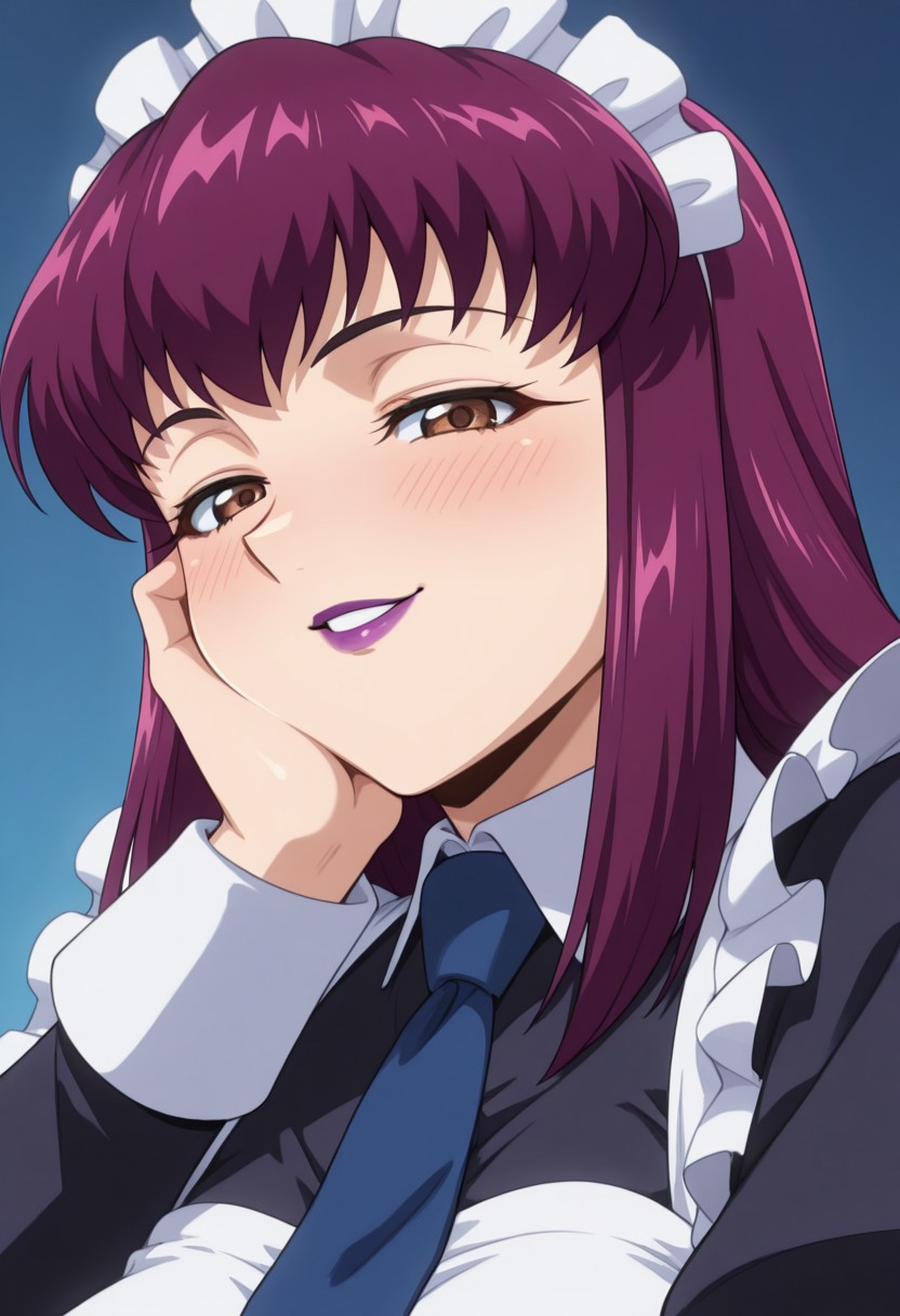 히비노 요요이, 보라색 머리, 긴 머리, 갈색 눈, 보라색 립스틱