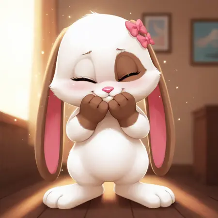 Snuggelina, bunny, girl, lop-eared, beige body, beige head, blue eyes, pink nose, brown eyelids, brown ears, brown hands, brown eyebrows, standing, two pink bows on the right ear, rabbit teeth