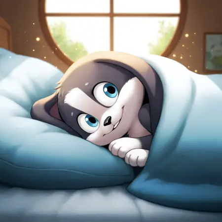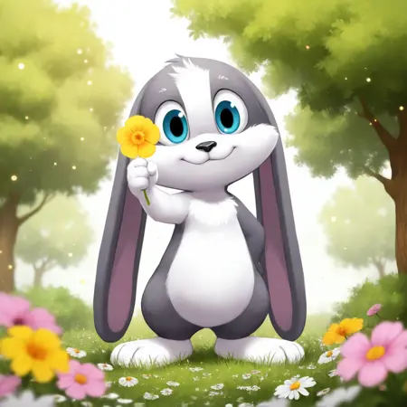 Schnuffel, bunny, lop-eared, boy, Black nose, blue eyes, white eyebrows, gray body, gray head, gray ears, white cheeks, white belly, white legs, white left arm