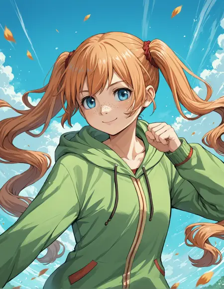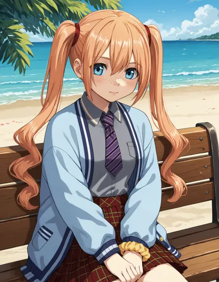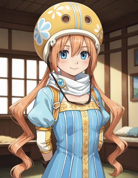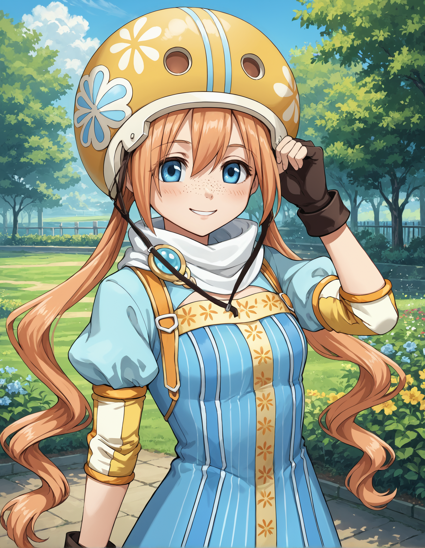 마법사 복장: mgrcyukarimiyuri, myrmgc, 낮은 트윈테일, 노란 헬멧, 흰 스카프, 파란 목 보석, 파란 드레스, 짧은 파란 줄리엣 소매, 노란 팔 보호대, 검은 손가락 없는 장갑, 노란 무릎 보호대, 검은 종아리 양말, 노란 롤러스케이트