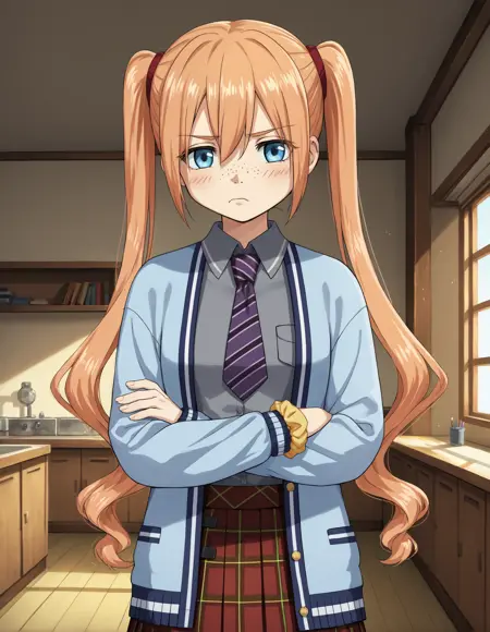 일상 복장: mgrcyukarimiyuri, myrcsl, 트윈테일, 빨간 스러칭, 회색 셔츠, 보라색 줄무늬 넥타이, 파란 오픈 카디건, 노란 팔찌, 빨간 접은 체크 스커트