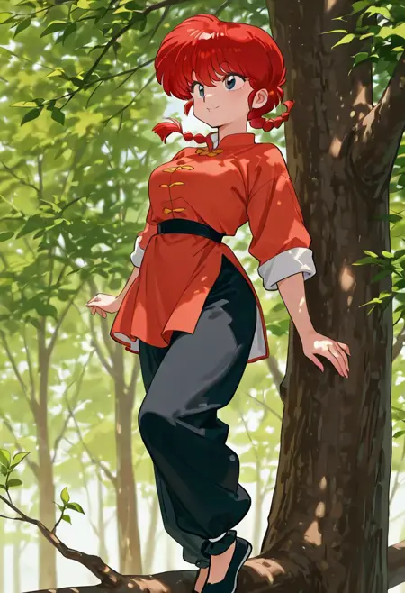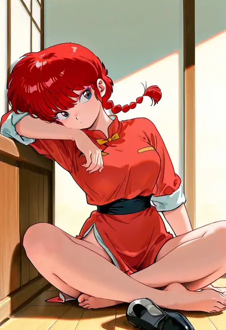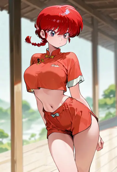outift1, 红色唐装,黑色裤子,中等胸部,袖子卷起,后跟鞋,