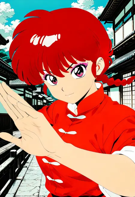 outift1, 빨간 탕주앙, 검은 바지, 중간 크기의 가슴, 소매 말아올리기, 뒤쪽 신발,