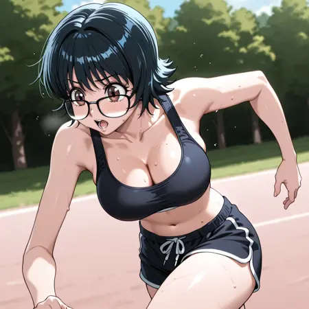 Trigger with bra: ShizukuBra, 1girl, glasses, tattoo,white underwear only, large breasts, panties, black hair, short hair, cleavage, white sports bra, navel, purple eyes