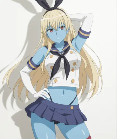 eyelashes, nose, long hair, blonde hair, colored skin, blue skin, red eyes,