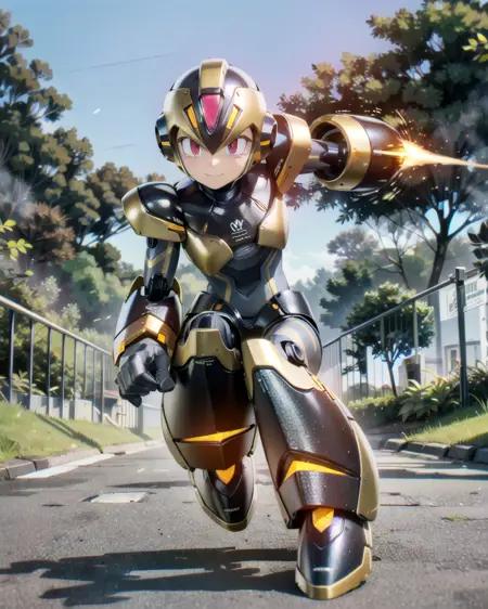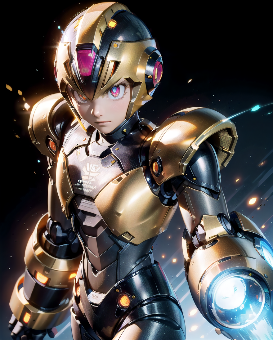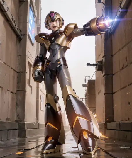 아마도 'kai (rockman x)', 'robot', 'android', 'mega man x dive', 'robot joint', 'helmet' 등의 프롬프트(트리거 단어)를 사용하면 이 로봇 캐릭터의 이미지를 생성할 수 있을 것입니다. 특징적인 버스터를 추가하려면 "Arm cannon" 프롬프트를 추가해 주세요.