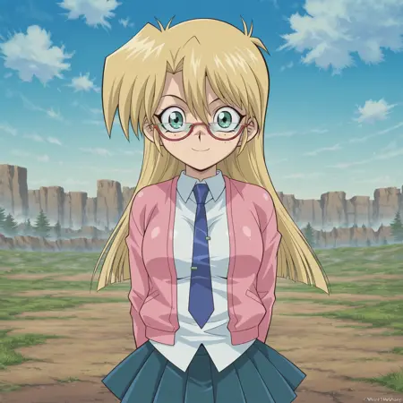 使用标签如 "yu-gi-oh!, rebecca hawkings, blonde hair, long hair, glasses, green eyes, freckles, skirt, uniform, necktie"