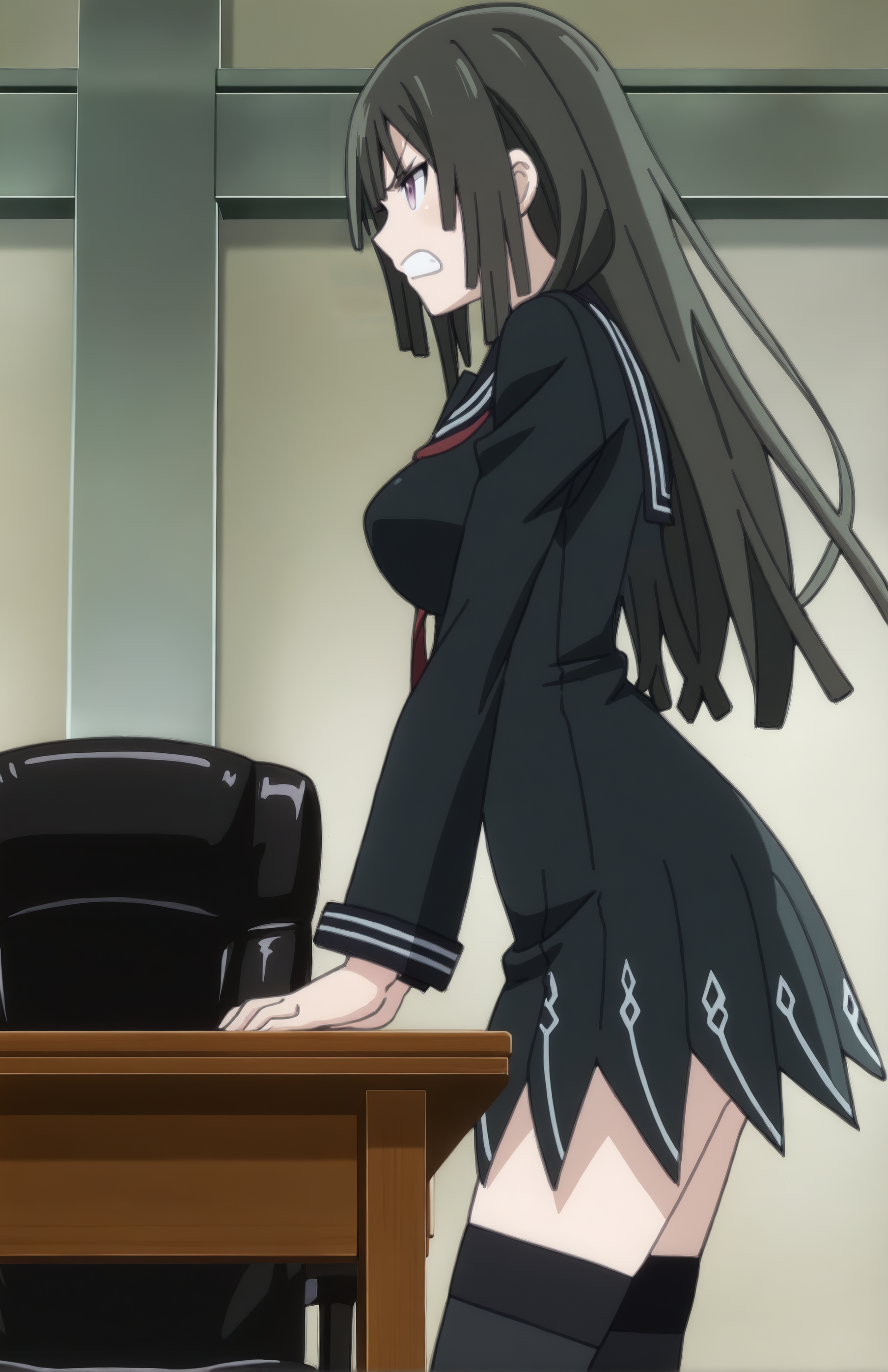 TendouKisara, long hair, black hair, purple eyes, school uniform, black serafuku, long sleeves, black thighhighs