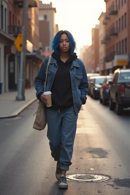 风格: 白天是钴蓝色头发与混搭街头服饰,夜晚则披上银色奢华与身体艺术