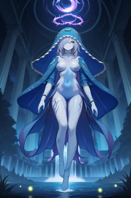 衣装:青いベール、青いマント、裸、乳首なし、性器なし、取り外し可能な袖、ヒダ付き袖、青い袖、短い袖、ブレスレット