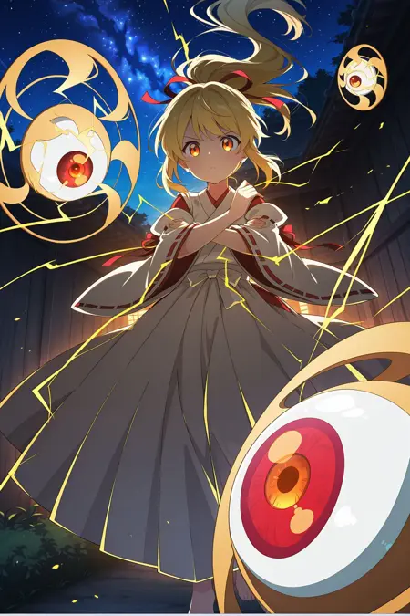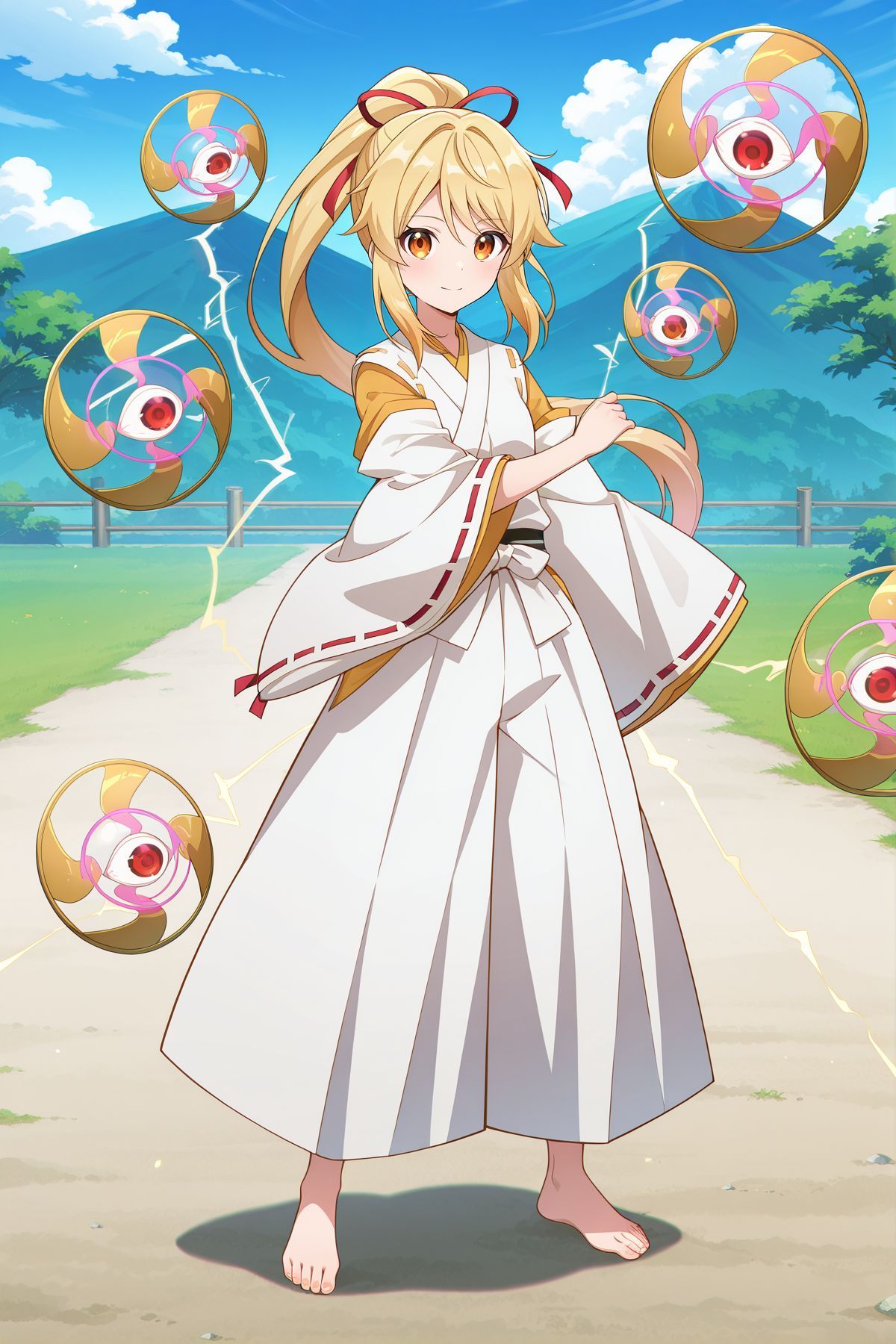 hair ribbon, red ribbon, white kimono, long sleeves, wide sleeves, ribbon-trimmed sleeves, detached sleeves, white pants, barefoot, eyeball, electricity,