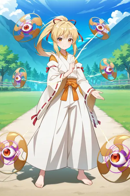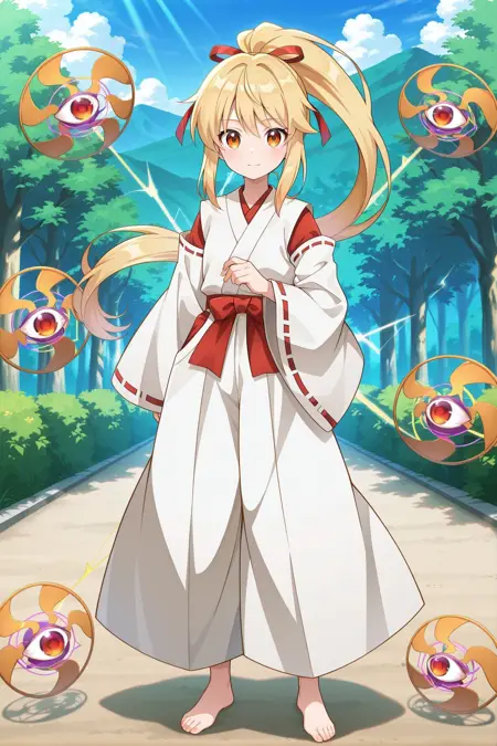 yuugenmagan, 1girl, solo, orange eyes, blonde hair, long hair, high ponytail, sidelocks,