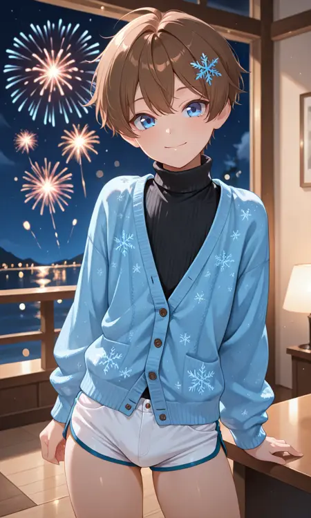 1boy, male focus, male, solo, otoko no ko, very short brown hair, short ahoge, blue eyes, snowflake hair ornament, blue snowflake cardigan, black turtleneck, white micro shorts, dolphin shorts, panty cut, striped leg warmers, brown footwear,