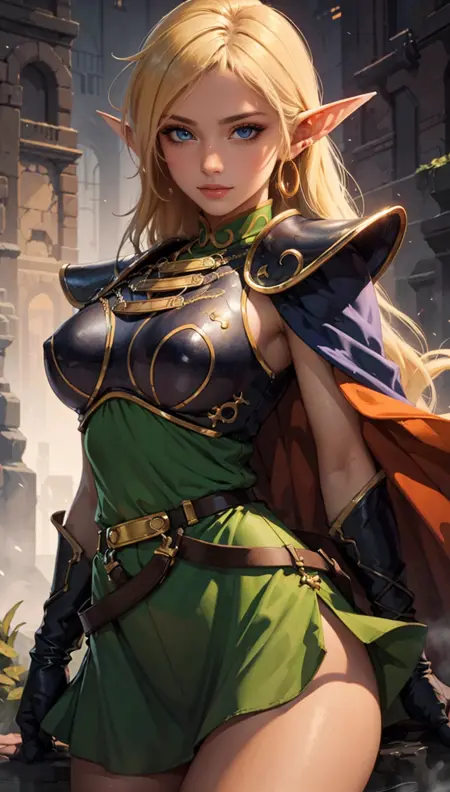• pointy ears, blonde hair, long hair, elf, circlet, green eyes, long pointy ears, very long hair, breasts, medium breasts, earrings, lips, makeup, bangs,