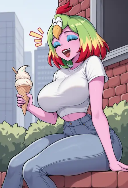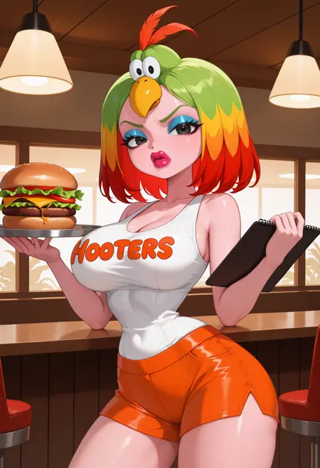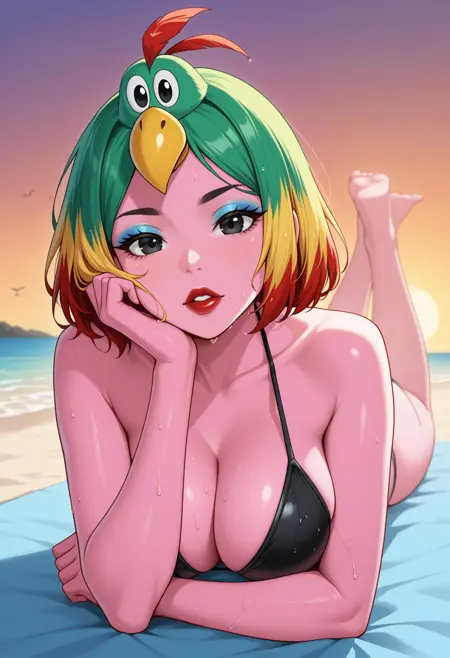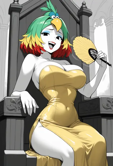 默认外观: vltna,头上停着鸟,绿色头发,多色头发,黄色头发,红色头发,粉红色皮肤,蓝色眼影,黑色眼睛,红色嘴唇,大胸部,无肩带连衣裙,黄色连衣裙,露乳,细腰,手镯,侧开衩,高跟鞋,红色鞋履