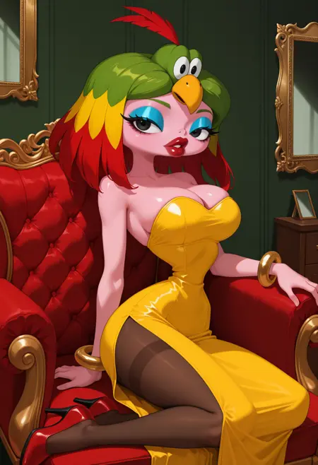 デフォルトの外見: vltna、頭に鳥、緑の髪、多色の髪、黄色の髪、赤い髪、ピンクの肌、青いアイシャドウ、黒い目、赤い唇、大きな胸、ストラップレスドレス、黄色いドレス、胸元の開き、細いウエスト、ブレスレット、サイドスリット、ハイヒール、赤い靴