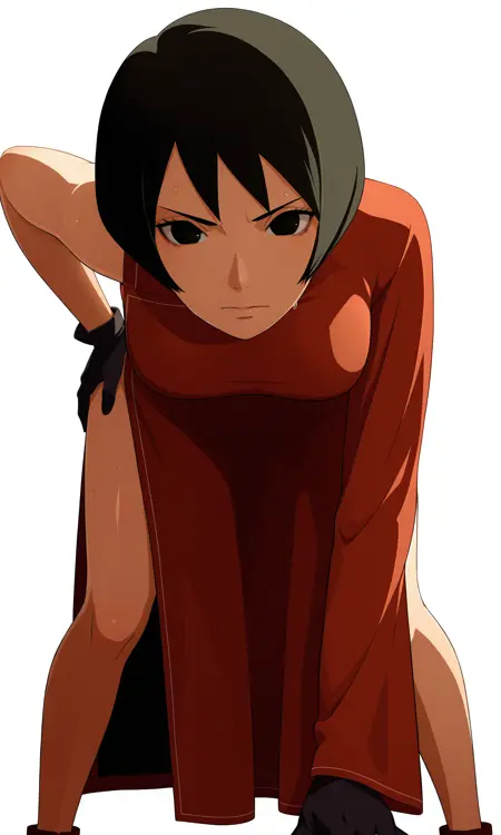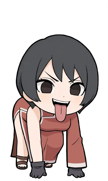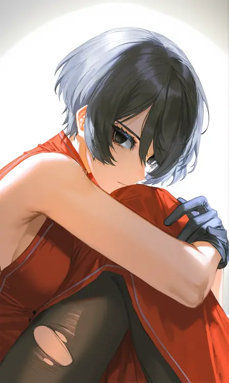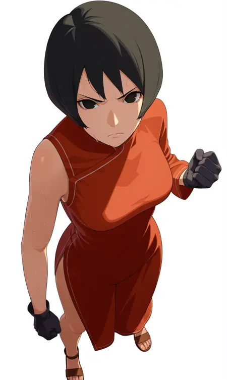 中国風のドレス、サイドスリット、片袖、長袖、肩出し、黒い手袋、サンダル、
