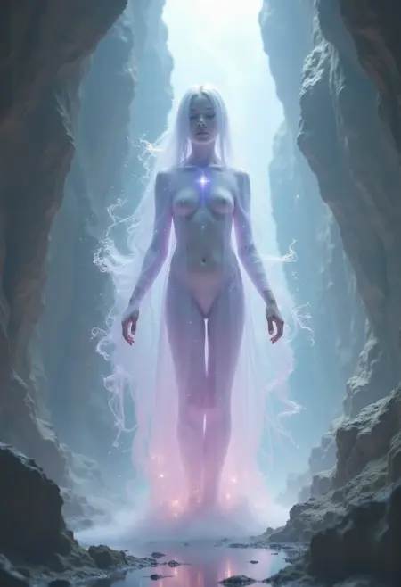 - 主体:一位幽灵般的女性形象伫立于狭窄的岩石峡谷中央。她苍白的肌肤、发光的眼睛与闪耀的胸腔,暗示其为一种灵体存在。